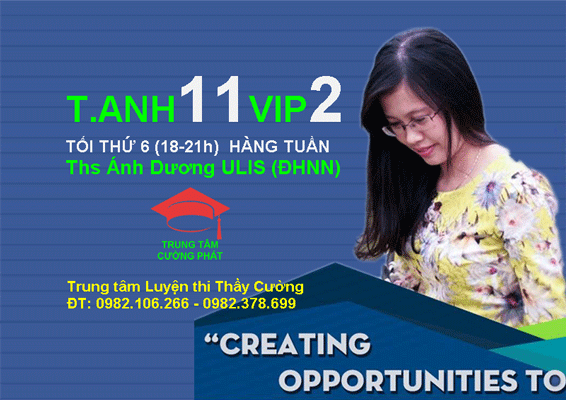 - T.Anh11VIP2: Tối Thứ 6 hàng tuần, từ 18-21h - GV: Ths Ánh Dương ULIS (ĐH Ngoại Ngữ, ĐHQGHN)